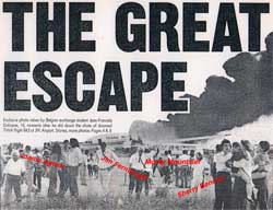 The pilots were in trouble- when the nose gear collapsed, it had dislodged one of the extra jumpseats along with the pilot who was sitting on the seat. Monty Mountsier, commuter seated in the aft second of two pilot jumpseats, was now pinned under the jumpseat, face down with a large gash on his arm, and his seatbelt wrapped around his neck. His seat was also blocking the cockpit exit door. Quick teamwork, the Chuck Long, Flight Engineer and Jim Fernbaugh, another commuter, managed to get Monty untangled, freeing up the cockpit door and themselves.Somehow in the middle of all of this chaos - Captain William Kinkead manages to announce on PA system to evacuate the aircraft immediately. Just before leaving - as is habit - Captain Kinkead put on his Captain's hat - later he laughed as to what purpose the hat may have served, but training had always been to wear the hat for visual identification.Now for the biggest shock of all - the pilots had no idea until they actually left the cockpit that their airplane was engulfed in flames and only 3 exits were usable. They were aware that fire existed, but could now see and smell the smoke moving into the First Class cabin. Captain Kinkead moved as quickly as he could towards the tail section of the airplane, looking for any passengers that needed his help. He stopped at the #2 left door to help Rose, Aleta and Marilyn, evacuate passengers. Time was of the essence.Chuck, the Flight Engineer, stationed himself mid cabin First Class, to move passengers out the exist and eventually battle with passengers over their carry-on luggage. The bags could block the exit and possibly causing serious injuries to others if anyone tripped on the bags. Surprisingly, Chuck found himself, along with the aid of another Flight Attendant, fighting with a passenger who insisted on dragging out a giant tusk hat - (some people just never get it). In fact three crewmembers actually fought with this passenger and his antler hat. Rose had actually taken the tusk away, tossed it into the middle of a Business Class aisle, only to have the passenger crawl over seats to retrieve the item. Chuck also fought with this same fellow over the tusk. Chuck and Rose both feared that the tusk could injure someone or destroy the slide.After the evacuation all of the crewmembers commented on passengers taking the time to retrieve their personal belongings from the overhead bins. What could possibly have been in those bags that was so valuable it was worth rising one's life.One woman, who did not speak English, decided to throw her body down in the middle of the First Class galley, legs and arms flailing about - screaming frantically. Crewmembers physically picked her up, pitching her out the emergency exit. Monty and Jim, the two additional pilots seated in the cockpit took positions at the bottom of slides #1 and #2 on the left side of the plane. The left #1 slide was starting to deflate, and the flat angle of the slide made getting off very difficult. Jim and Monty both grabbed the passengers as they came down and moved them away from the slide area. Potential for injury was great, and it would only have taken one passenger to create a horrible pile-up. Captain Kinkead then moved into main cabin area, looking for anyone who might need help. Smoke and fire now completely filled the main cabin. He looked into the main cabin as far as he could possibly see and prayed that no one was left behind. Captain Kinkead knew it was impossible to go any further.Capt. Kinkead was the last person to leave the aircraft.